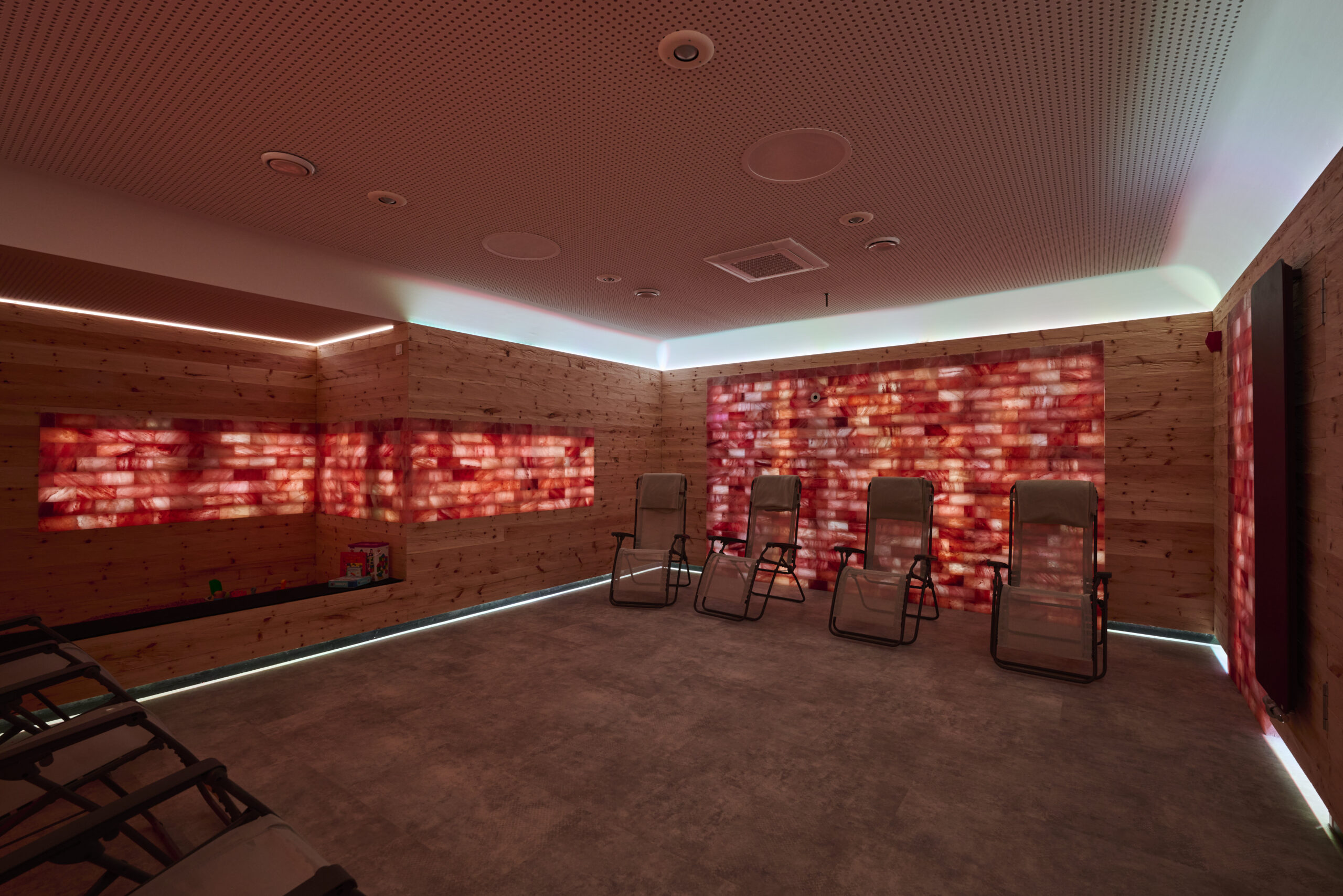 Tauche ein in eine Oase der Ruhe und Erholung. Unser neu gestalteter Salzraum verbindet modernste Technik mit natürlichen Materialien und schafft so ein ganz besonderes Wohlfühlambiente. Die Wände sind mit edlem Zirbenholz und hochwertigen Himalaya-Salzsteinen ausgestattet. Der Raum schafft durch den natürlichen Duft und das angenehme Lichtkonzept eine wohltuende Atmosphäre.